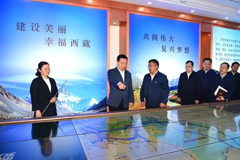 王君正走进陈列室、智慧旅游调度室,认真了解西藏旅游产业发展、宣传推介、发展趋势等情况,现场观摩智慧旅游调度工作。