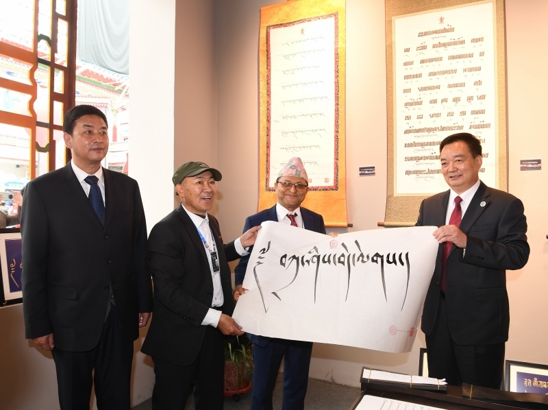 这是中国西藏旅游文化国际博览会期间,王君正向尼泊尔联邦院主席加内什·普拉萨德·蒂米尔西纳赠送藏文书法作品。西藏日报记者 李洲 摄