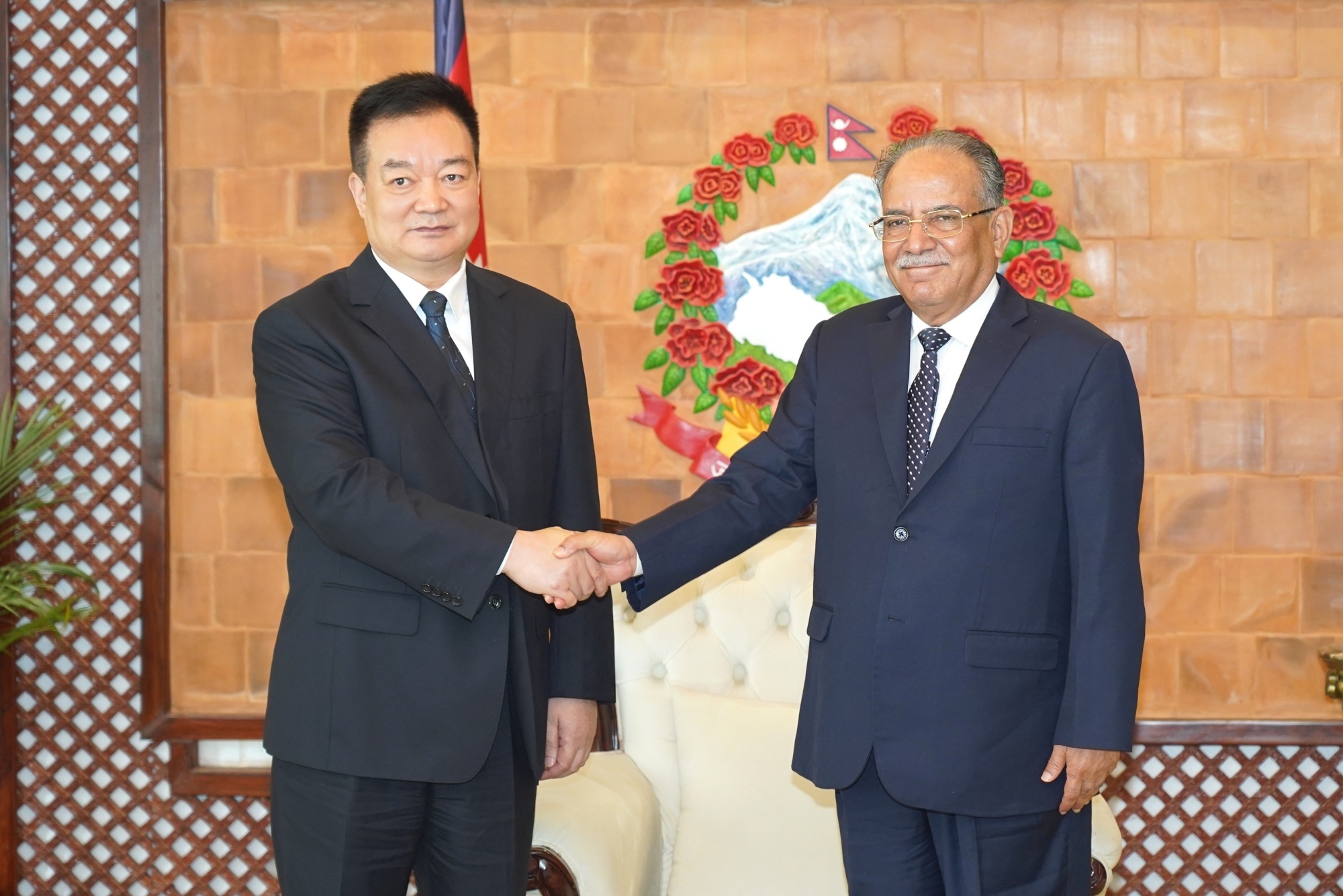 11月8日至17日,西藏自治区党委书记王君正率西藏自治区代表团访问尼泊尔、斯里兰卡、新加坡,这是王君正拜会尼泊尔总理普拉昌达。西藏日报记者 旦增西旦 整理