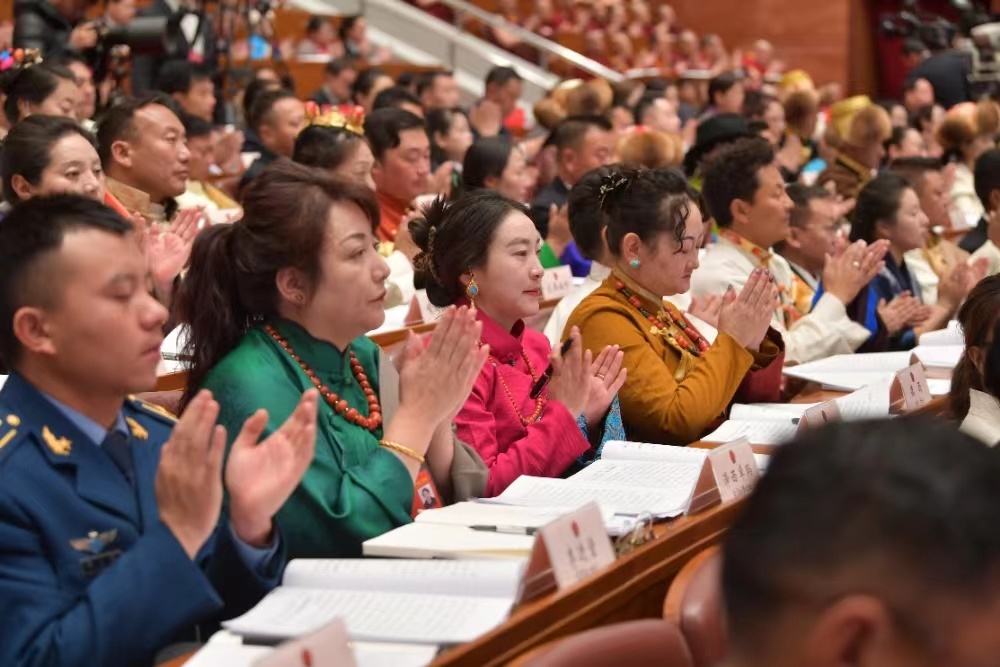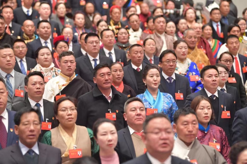 上午9时30分许,洛桑江村宣布:西藏自治区第十二届人民代表大会第二次会议开幕。会场全体起立,高唱国歌。