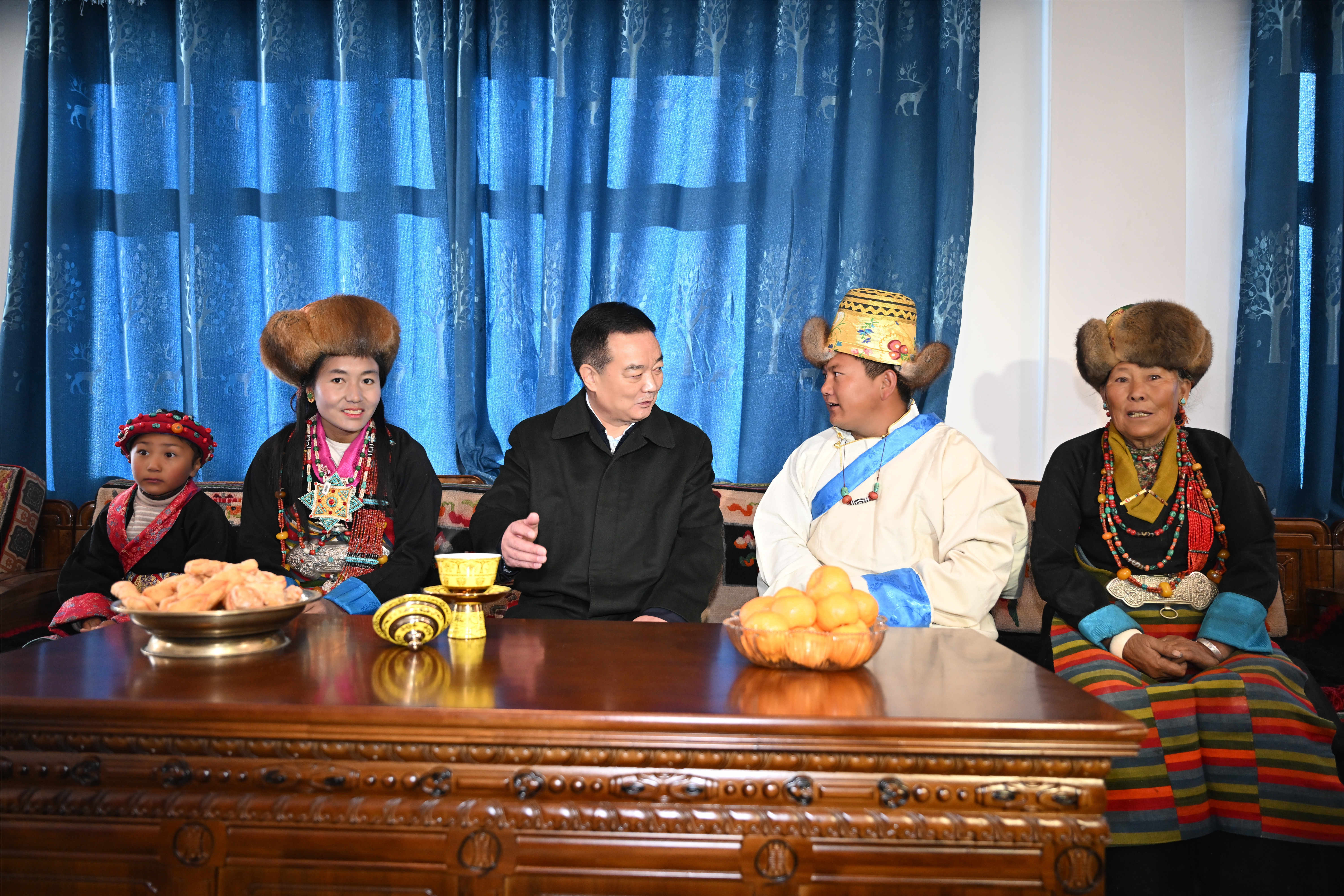 12月2日至3日,自治区党委书记王君正在日喀则市萨迦县、拉孜县调研,宣讲党的二十届四中全会精神和自治区党委十届九次全会精神。这是王君正在萨迦县查荣乡江雄村村民次平家中亲切交谈。记者 旦增西旦 摄