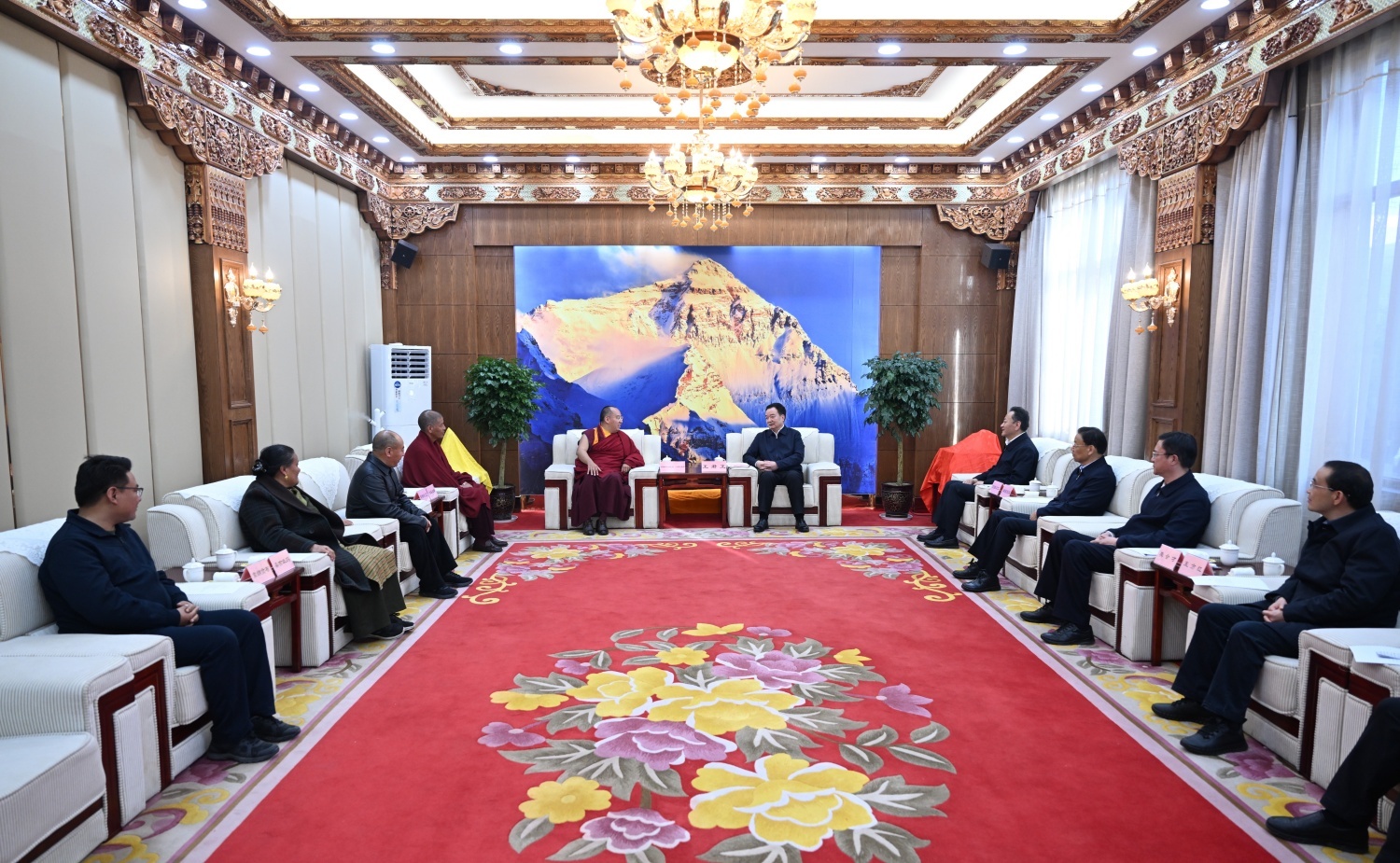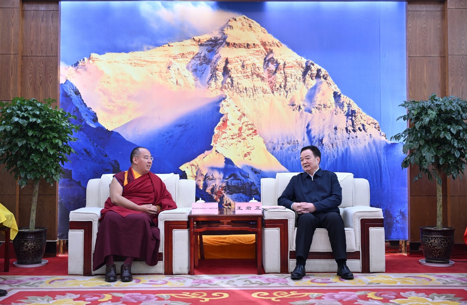 近日,自治区党委书记王君正在日喀则市调研宗教工作。调研中,王君正会见了班禅额尔德尼·确吉杰布。西藏日报记者 旦增西旦 摄