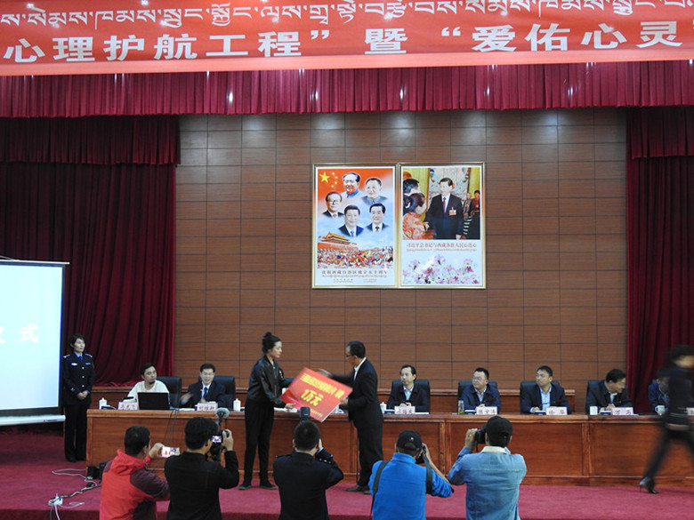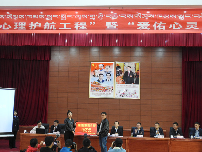 7月24日上午,西藏自治区红十字会在司法厅会堂隆重举办“雪域心理护航工程暨爱佑心灵博爱基金”启动仪式。仪式由主要筹划和牵头的中央第十八批博士服务团赴西藏团副团长、西藏自治区红十字会党组成员、副会长刘维新主持。自治区红十字会巡视员廖贻东,卫计委副主任徐华,教育厅副厅长朱赟,司法厅政治部主任陈京涛和财政厅有关领导出席,并作了重要讲话。西藏3家爱心企业现场为“雪域心理护航工程暨爱佑心灵博爱基金”捐赠21万元。“悟纳合聚成爱” 30余名心里志愿服务团在马龙飞团长的带领下,徒搭318川藏线,经历13天2000余公里,不畏高原缺氧、历尽艰苦,专程赴藏参加仪式,捐款25万元,开展系列心理辅导讲座。